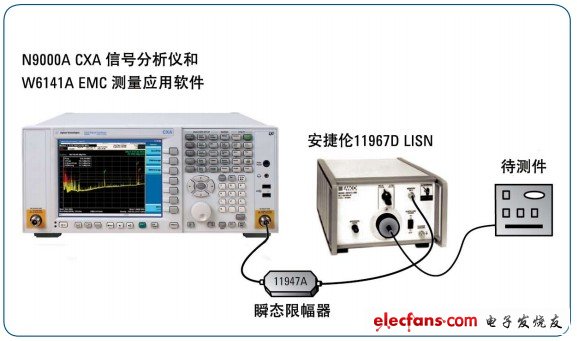 拾取电源线上传播干扰信号的最常用设备是线性阻抗匹配网络(LISN) 。而瞬态限幅器可以有效的避免频谱分析仪或者接收机被LISN 产生的大功率瞬态信号损 坏。而传导测试的被测件,附件和频谱仪完全是通过电缆连接,所以非常容易实现且不易受到干扰。我们用类似的方法进行预兼容测试,得出的结果往往可以和EMC 认证机构得出的测试结果很好吻合。