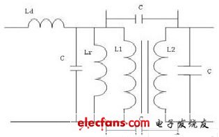 逆变部分是开关稳压电源的核心,用以实现变压、变频以及完成输出电压的调整,主要有开关管和高频变压器组成。电磁噪声主要是由于变压器的漏感、分布电容以及开关管的开通、关断造成。开关电源中的高频变压器用作隔离和变压,变压器在理论分析时,通常认为是理想变压器,但是在实际应用中变压器存在漏感,而且在高频的情况下,还要考虑变压器层间的分布电容。高频变压器的等效电路模型如图3所示。