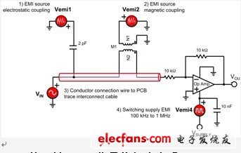 图 1 显示了一些会进入到您的 PCB 线迹中的 EMI 干扰源情况。Vemi1 源自开关网络,例如:时钟信号或者