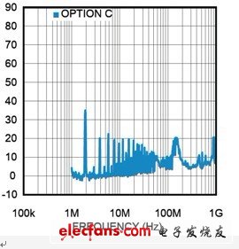 输入和输出针脚使用10 ?F滤波器时的传导性EMI测量。