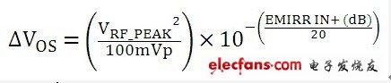 方程式 1 中,VRF_PEAK 为所用 RF 电压的峰值,VOS 为放大器的 DC 偏移电压,而 100 mVP 为 100 mVP 输入信号 EMIRR IN+ 参考。