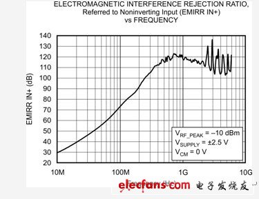 您可以利用 EMIRR 衡量标准,比较放大器的 EMI 抑制性能。图 2 显示了 TI OPA333 CMOS 运算放大器的 EMIRR IN+ 响应。该图表明,这种器件可以较好地抑制器件300 kHz带宽以上的频率信号。