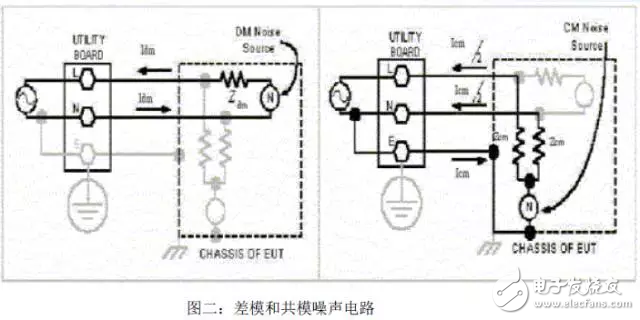 由EMI产生的噪声也分成两类:差模噪声和共模噪声。简而言之,差模噪声是当两条电源供应线路的电流方向互为相反时发生的,如图1(a)所示。而共模噪声是当所有的电源供应线路的电流方向相同时发生的,如图1(b)所示。一般而言,差模讯号通常是我们所要的,因为它能承载有用的数据或讯号;而共模讯号(噪声)是我们不要的副作用或是差模电路的‘副产品’,它正是EMC的最大难题。