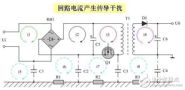 传导干扰分差模干扰DI和共模干扰CI两种。先来看看传导干扰是怎么产生的。如图1所示,回路电流产生传导干扰。这里面有好几个回路电流,我们可以把每个回路都看成是一个感应线圈,或变压器线圈的初、次级,当某个回路中有电流流过时,另外一个回路中就会产生感应电动势,从而产生干扰。减少干扰的最有效方法就是尽量减少每个回路的有效面积。