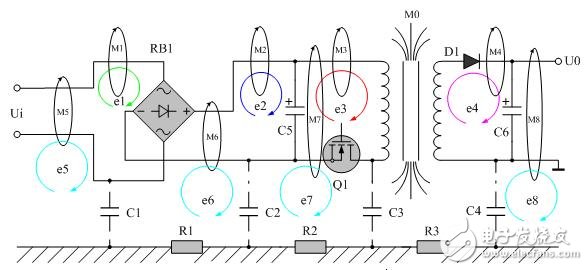 如图2 所示,e1、e2、e3、e4为磁场对回路感应产生的差模干扰信号;e5、e6、e7、e8为磁场对地回路感应产生的共模干扰信号。共模信号的一端是整个线路板,另一端是大地。线路板中的公共端不能算为接地,不要把公共端与外壳相接,除非机壳接大地,否则,公共端与外壳相接,会增大辐射天线的有效面积,共模辐射干扰更严重。降低辐射干扰的方法,一个是屏蔽,另一个是减小各个电流回路的面积(磁场干扰),和带电导体的面积及长度(电场干扰)。