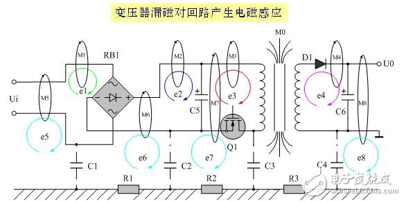 如图3所示,在所有电磁感应干扰之中,变压器漏感产生的干扰是最严重的。如果把变压器的漏感看成是变压器感应线圈的初级,则其它回路都可以看成是变压器的次级,因此,在变压器周围的回路中,都会被感应产生干扰信号。减少干扰的方法,一方面是对变压器进行磁屏蔽,另一方面是尽量减少每个电流回路的有效面积。