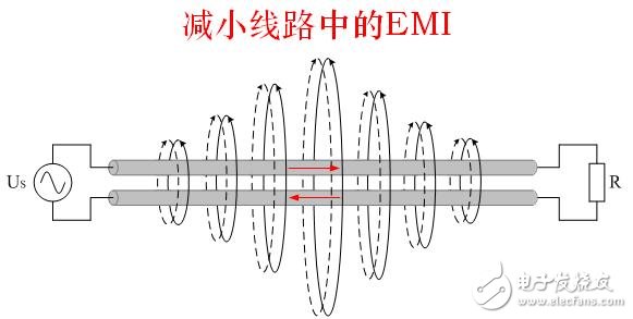 如图5所示,两根相邻的导线,如果电流大小相等,电流方向相反,则它们产生的磁力线可以互相抵消。对于干扰比较严重或比较容易被干扰的电路,尽量采用双线传输信号,不要利用公共地来传输信号,公共地电流越小干扰越小。当导线的长度等于或大于四分之一波长时,传输信号的线路一定要考虑阻抗匹配,不匹配的传输线会产生驻波,并对周围电路产生很强的辐射干扰。