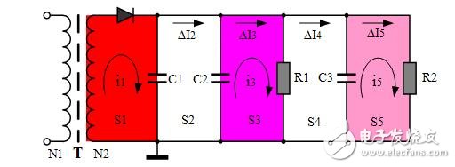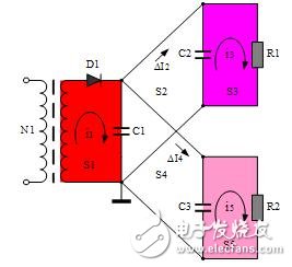 下面以图7示意,对电流回路辐射进行详解。如图,S1为整流输出滤波回路,C1为储能滤波电容,i1为回路高频电流,此电流在所有的电流回路中最大,其产生的磁场干扰也最严重,应尽量减小S1的面积。