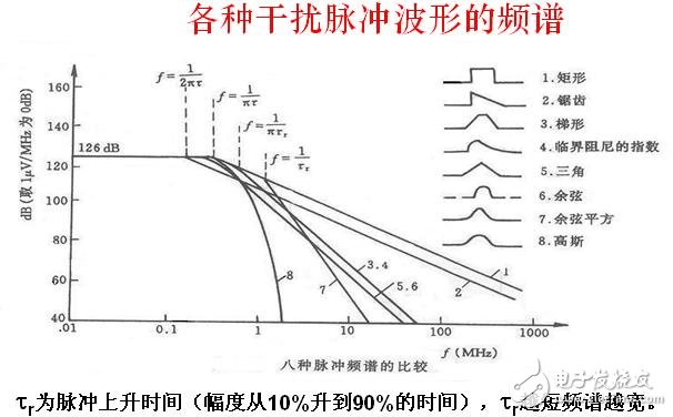 看到这里,是否觉得按此八步走,传导干扰尽在掌握之中?最后附上各种干扰脉冲波形的频谱供大家参考(如图10)。任何一个非正弦波都可以看成是非常多个上升和下降速率不同的信号(或不同频率的正弦波)相互迭加而成,电磁辐射强度与电压或电流的变化速率成正比。