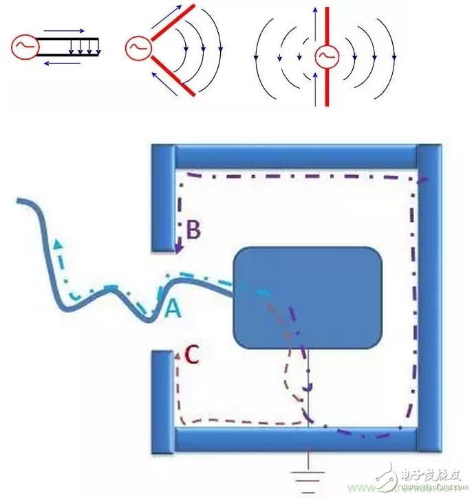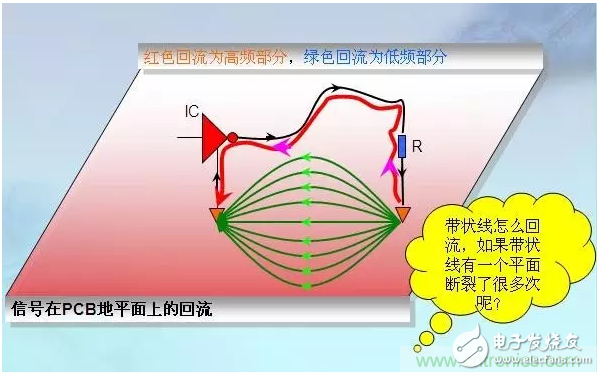 试想,假如在高频回流的地方(GND或者VDD)平面引一个长长的地线出来,并且PCB平面对引出的线屏蔽效能不够,这样这个引线就具有很高的辐射效率了。