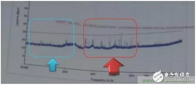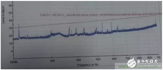 本项目中,在进行RE102测试中,频段200MHz~1GHz中200多MHz单点超标,且高频有杂散单点较高,其数据见下图: