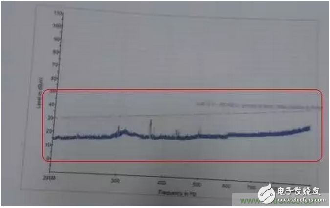 种种迹象表明我们还有其他的噪声产生源头没有找到,于是我们将机器拆开,专门研究线缆这边到底有没有接地好,我们终于找到原因,接地处线缆的外部屏蔽层在从机器出现的地方隔离着塑料塞子。将塞子去掉或者包上导电布,RE辐射立即OK了,请看下图: