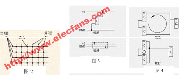 如果不能采用多层电路板,那麽用於电源线和接地的线必须连接成如图2 所示的网格状。网格连接可以起到电源和接地层的作用,用过孔连接各层的印制线,在每个方向上过孔连接间隔应该在6 厘米内。另外,在布线时,将电源和接地印制线尽可能靠近也可以降低环路面积,如图3 所示。