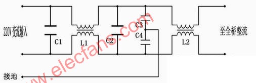 EMI滤波器主要作用是滤除外界电网的高频脉冲对电源的干扰,同时也起到减少开关电源本身对外界的电磁干扰。实际上它是利电感和电容的特性,使频率为50Hz左右的交流电可以顺利通过滤波器,但高于50Hz以上的高频干扰杂波被滤波器滤除,所以它又有另外一种名称,将EMI滤波器称为低通滤波器(彩电上的称法),其意义为,低频可以通过,而高频则被滤除。下面是EMI滤波电路的线路图: