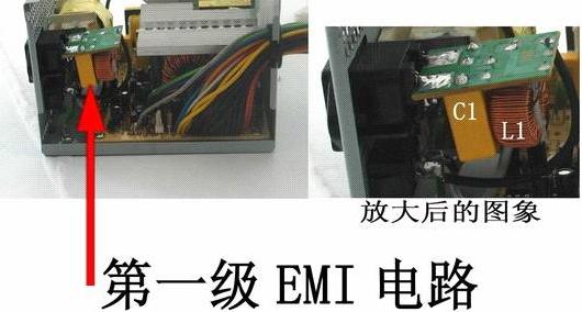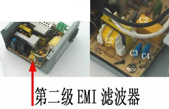 在优质电源中,都有两道EMI滤波电路,其中一路在电源插座处,另外一路在电源的PCB板上(也有把两道EMI滤波电路都做在PCB板上的情况),这两道EMI电路,可以很好地滤除电网中的高频杂波和同相干扰电流,同时把电源中产生的电磁辐射削减到最低限度,使泄漏到电源外的电磁辐射量不至于对人体或其它设备造成不良影响。劣质电源通常会省去第一级EMI滤波电路,甚至连第二级EMI滤波电路也省掉。