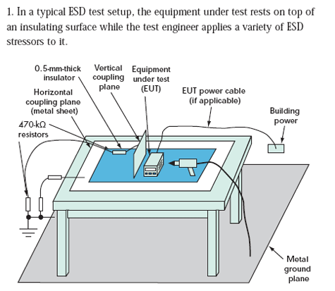 对于小型产品来说,工程师经常在专门的测试环境中执行系统级ESD测试(图1)。对IEC 61000-4-2测试而言,这些测试环境包括:地板上的金属接地板、木桌、放在桌子上的金属水平耦合板(到接地板有个0.95米长的连线,在水平耦合板之上的一个0.5mm绝缘层)。