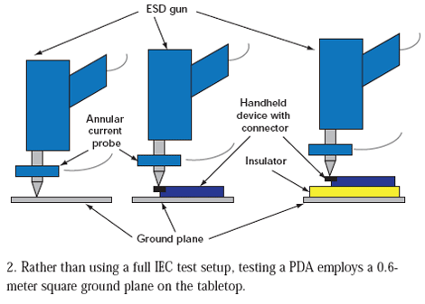 这样的测试环境必然能实现可重复的结果。首先,将被测设备(EUT)放在绝缘表面上,然后从不同的方向对EUT施加冲击。例如,给导电表面施加接触放电,这些表面包括所有金属外壳和连接器的接地金属壳。也可以向四周绝缘表面进行空气放电,并将重点放在可能的ESD路径上,比如设备外壳中的缝隙以及所有通风孔及键盘。