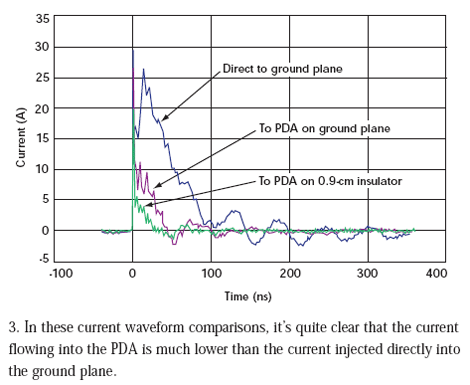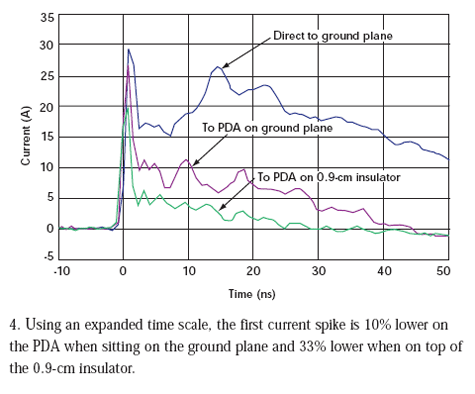 但是,我们见到的电流减小前后并不一致。当PDA直接放在接地板上时,初始电流尖峰降低了10%。当PDA放在0.9cm绝缘层上时,初始电流尖峰减低33%(图 4)。在20ns点,直接放在接地板上的PDA受到的冲击要小69%,而位于绝缘层上的PDA受到的冲击要小93%。电流减少是在冲击状态下给PDA充电的结果。在每次冲击测试过程结束后,我们必须将PDA接地使它回到未充电状态才能进行下次测量。