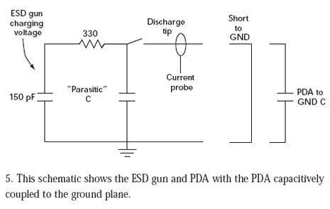 向PDA的放电通过一个并行平板电容表示,其中一个极板是PDA的一部分,另一个极板是接地板。在脉冲初期,PDA电容提供较低的阻抗,注入进PDA的电流近似于到地的放电电流。继续施加脉冲,电荷在PDA到接地板电容中累积,因此PDA上的电位上升,直到PDA和接地板之间的电位和150pF电容上的电压相等。这时,不再有电流流动,即使ESD qiang的电容还没有完全放电。