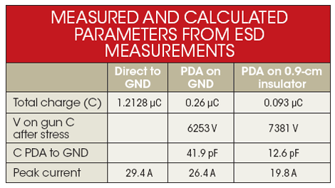 对充电到PDA的电流进行积分,可以得到从ESD qiang转移到PDA的电荷数量。从ESD qiang转移到PDA的电荷量可以用来计算ESD qiang的150pF电容上剩下的电压,然后再算出PDA上的电压。理解这个电压以及PDA上测到的电荷之后,就可以计算出PDA和接地板之间的电容(见表1)。