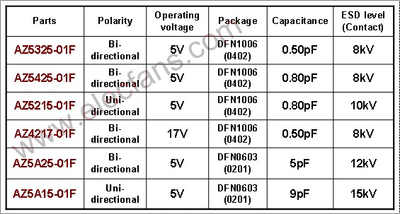 在ESD耐受能力方面,这系列ESD保护组件都能满足IEC 61000-4-2接触模式至少8kV的ESD轰击,其中AZ5A15-01F使用0201封装尺寸其ESD耐受度更可高达15kV。