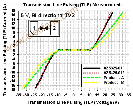 在ESD箝制电压的表现,这系列ESD保护组件拥有最低的ESD箝制电压,可有效防止讯号受到ESD冲击所干扰,让系统有机会通过Class-A的IEC 61000-4-2系统级静电放电测试。利用传输线脉冲系统(TLP)测量具低电容的5-V双向ESD保护组件–AZ5325/AZ5425-01F及5-V单向ESD保护组件–AZ5215-01F,分别如图一及图二所示。观察TLP电流为17A(等效IEC 61000-4-2接触模式6kV测试)时的箝制电压,与其它相同应用的产品作比较,均具有最低的箝制电压,其中AZ5215-01F箝制电压更仅有11V,能提供系统产品于ESD测试时最佳的防护效果。