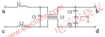 图3是对共模噪声和差模噪声都有效的滤波器电路。其中,L1、L2、C1为抑制差模噪声回路,L3、C2、C3构成抑制共模噪声回路。L1、L2的铁心应选择不易磁饱和的材料及M-F特性优良的铁心材料。C1使用陶瓷电容或聚酯薄膜电容,应有足够的耐压值,其容量一般取0.22μF -0.47μF。L3为共模电感,对共模噪声具有较高的阻抗、较好的抑制效果。