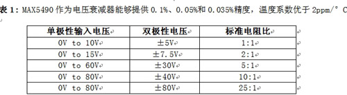 表1: MAX5490作为电压衰减器能够提供0.1%、0.05%和0.035%精度,温度系数优于2ppm/°C