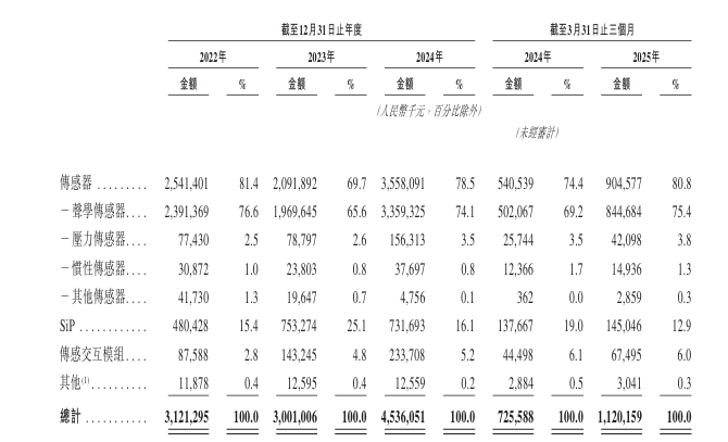 传感器是主要的营收来源,2024年的营收占比达到78.5%,达到35.58亿元。其中声学传感器的营收占比达到74.1%。