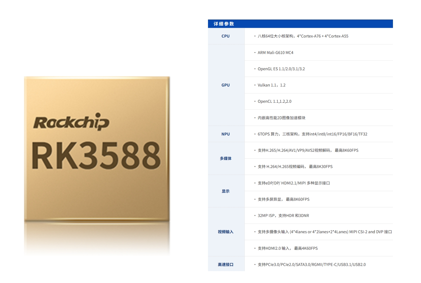 RK3588采用8nm先进制程、8核64位大小核架构(4*Cortex-A76 + 4*Cortex-A55),ARM Mali-G610 MC4 GPU,专用2D图形加速模块,搭配6TOPS算力NPU,赋能各类AI场景。具有8K视频编解码,8K显示输出,内置多种显示接口,支持多屏异显,超强影像处理能力,48MP ISP,支持多摄像头输入,拥有丰富的高速接口包括PCIe,TYPE-C,SATA,千兆以太网,易于扩展,支持Android 和Linux OS。