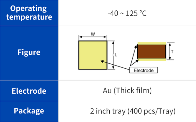 此系列热敏电阻是一种在陶瓷上下表面形成金电极的产品。它可通过引线接合进行安装,因此具有可自行配置安装位置的特点。其工作温度范围为‐40℃~125℃,在高温环境下也能发挥出色的性能。
