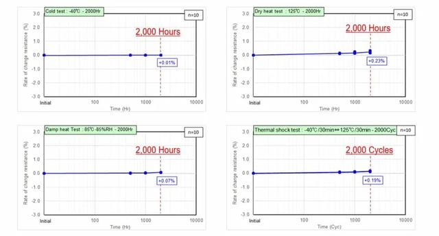 产品在各种工况下都具有高可靠性。比如,产品通过严苛的高温试验,在125℃的环境中放置2000小时后,其电阻值变化率仅为+0.23%,因此能确保在恶劣的环境下维持稳定的性能。此外,产品还通过热冲击试验,在低温(-40℃)和高温(125℃)环境下交替放置30分钟,先后经历2000次的剧烈温度变化,即使经过如此严苛的实验条件,其测量结果依然非常稳定,试验后的电阻值变化率仅为+0.19%。