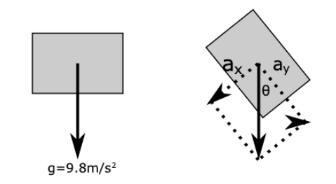 顺便提一下,由于重力也是作用在物体上的力,因此也会产生加速度(重力加速度:9.8[m/s2])。换言之,通过测量静止(准确地说是加速度为零=匀速运动)物体的三维加速度,可以知道该物体相对于水平面的倾斜度(方向)。