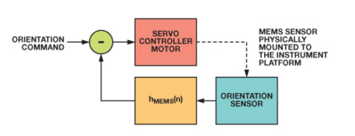 图1是平台稳定系统的整体框图,它使用伺服电机来校正角向运动。反馈传感器为仪器平台提供动态方位信息。反馈控制器处理这些信息,并将其转换为伺服电机的校正控制信号。