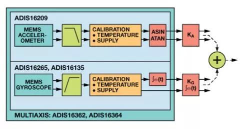 图2的整体框图显示了如何使用陀螺仪和加速度计测量,既利用它们的基本优势,同时又最大程度减少它们的弱点产生的影响。