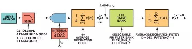 为快速评估与这些滤波器相关的时间延迟,请注意单极滤波器的相位延迟在−3 dB频率下等于45°,也就是转折频率周期的1/8。在此情况下,加速度计的滤波器的时间延迟大约等于0.38 ms。对于陀螺仪,延迟等于两级的时间延迟的总和,约为0.47 ms。