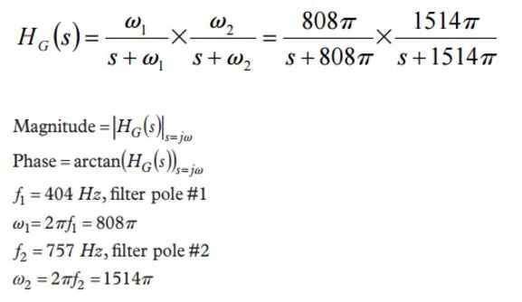 此外,每个陀螺仪传感器在通过ADC模块之前都会通过双极低通滤波器。这样可以提供足够的信息,以便使用拉普拉斯变换来开发S域中的传递函数表示。第一极(f1)的频率为404 Hz,第二极(f2) 的频率为757 Hz。