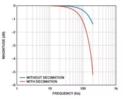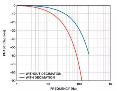 图4和图5提供了复合幅度和相位响应,包括陀螺仪的模拟滤波器和两个抽取滤波器。图4表示针对数组中的每个频率,将各级的幅度相乘的结果。图5表示将每个频率下的各级的相位贡献相加的结果。标记"没有抽取"的坐标图假定输出数据速率为2460 SPS,第二个抽取滤波器级有效关闭。标记"有抽取"的坐标图假定抽取率等于6,最终输出数据速率为410 SPS。两个坐标图说明了响应差异,帮助实现控制环路采样速率和相应频率响应的系统级平衡。