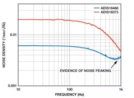图6详细说明了使用相同双极低通滤波器的两个例子。第一个例子 (ADIS16375)使用了在有用频率范围内具有平坦响应的陀螺仪。第二个例子(ADIS16488)使用在1.2 kHz频率下具有适中峰化量的陀螺仪,它实际上将–3 dB频率扩展到大约380 Hz。对于在为控制环路进行建模和仿真的人员而言,了解这种共振行为可能是非常有价值的。在简单测试中识别这种行为,还有助于解释在执行更全面系统特征化时噪声电平高于预期的原因。如果在项目早期了解和识别这些行为,则通常可通过对滤波器极点的调整,对它们进行管理。