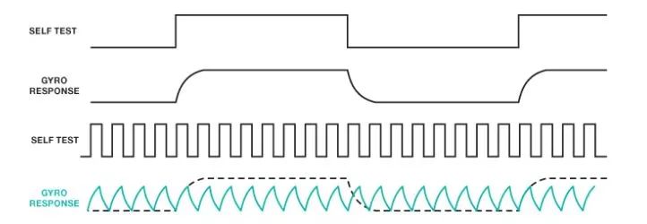 另一种方法使用了陀螺仪的自测功能。自测功能提供了使用电气信号来模拟传感器的机械结构的机会,而无需对设备施加外部惯性运动。自测功能迫使模拟对实际运动的响应的传感器内核中发生变化,从而在电气输出上产生相应变化。并非所有产品都提供对此信息的实时访问,但它可能是一种有用工具,另外制造商或许能够提供此种类型的频率-响应测试的数据。在最简单的方法中,可将自测(模拟对步骤的响应)与分析预期结果进行比较。重复在特定频率下的自测置位,也是一种研究每个频率下的传感器响应幅度的直接方法。以图7中的两种不同响应为例。在较低频率下,陀螺仪输出类似于方波,每个转换的瞬态响应除外。瞬态响应符合传感器信号链中的滤波器网络的"步骤响应"预期。在第二个示例中,自测的频率足够高,能够防止完全建立,因而发生了幅度减小。请注意在本图底部信号上,蓝色和黑点响应之间的幅度差异。有多种方法可以估测这些时间记录的幅度。离散傅里叶变换(DFT)可将主要频率成份(自测频率)与谐波内容隔离开,这可能导致幅度/频率响应的误差。