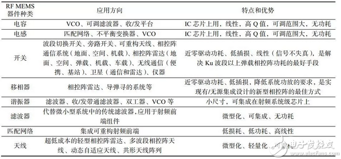 RF MEMS器件主要有:①基于开关基本结构单元的移相器、可调滤波器、可变波束天线等,应用于相控阵雷达系统、平面阵列扫描天线等;②硅基/熔融石英基的高性能滤波器,应用于军用雷达/卫星通信、电子对抗等;③超小型化的声波滤波器(SAW、FBAR),大量应用于手机、无线人机交互设备、导航、微纳卫星等;④微纳电感、电容结构组成的天线阵列,用于雷达、电子对抗等;⑤微纳传输线/波导结构(如微同轴结构)组成的高性能T/R组件等。各类RF MEMS器件及其应用方向和优势特点见表1。