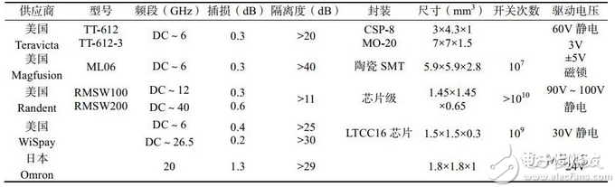 RF MEMS开关及衍生器件大量应用在射频微波单机和系统领域,如美国Randent MEMS公司、RockWell公司、MEMTronics 公司(从Raython公司独立出来)生产的基于开关的产品大量应用于DARPA和NASA主导的军事用途设备和系统中,日本Omron公司、美国WiSpry公司(被瑞声科技收购)生产的开关系列产品应用于民用领域,包括智能手机、导航终端、物联网等。目前商业化的MEMS开关产品比较见表2。