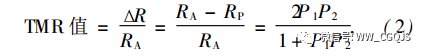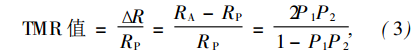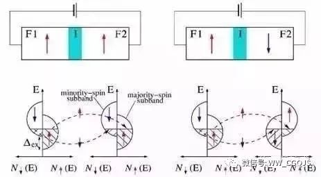若两层磁化方向互相平行,则在一个磁性层中,多数自旋子带的电子将进入另一磁性层中多数自旋子带的空态,少数自旋子带的电子也将进入另一磁性层中少数自旋子带的空态,总的隧穿电流较大;若两磁性层的磁化方向反平行,情况则刚好相反,即在一个磁性层中,多数自旋子带的电子将进入另一磁性层中少数自旋子带的空态,而少数自旋子带的电子也将进入另一磁性层中多数自旋子带的空态,这种状态的隧穿电流比较小。因此,隧穿电导随着两铁磁层磁化方向的改变而变化,磁化矢量平行时的电导高于反平行时的电导。通过施加外磁场可以改变两铁磁层的磁化方向,从而使得隧穿电阻发生变化,导致TMR效应的出现。