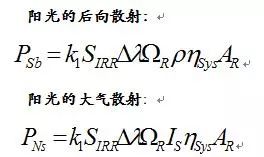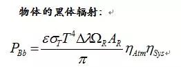 上式中,ε是目标的辐射系数;ρ是目标的反射系数;T是目标的温度(K);Δλ是光波长范围(μm);AR是接收机探测器敏感面面积(m²);k1是太阳光通过大气的透过系数;SIRR是太阳的辐射度(是大气的散射系数;ηSys是系统的光学效率;ΩR是辐射体辐射的能量的立体角;σT是斯特藩-玻耳兹曼常数。