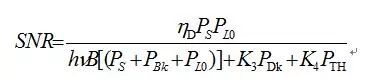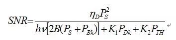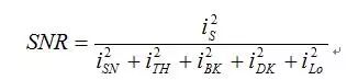 式中, 是信号电流的均方值; 是散弹噪声电流的均方值; 是热噪声电流的均方值; 是背景噪声电流的均方值; 是暗电流的均方值;是本振电流的均方值。