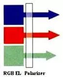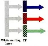 此种技术是利用白光OLED结合彩色滤光膜,首先制备发白光OLED的器件,然后通过彩色滤光膜得到三基色,再组合三基色实现彩色显示。