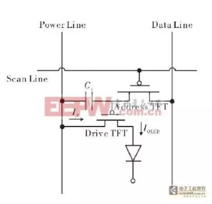 对于OLED驱动控制系统的实现,关键技术在于数据的写入和扫描控制,如上图所示为单个像素的双管驱动电路。一个TFT用来寻址,另一个是电流调制晶体管,用来为OLED提供电流。为防止OLED开启电压的变化导致电流变化,使用的是P沟器件,这样OLED处于驱动TFT的漏端,源电压与有机层上的电压无关。Data Line 与寻址TFT的源级相连,ScanLine使地址TFT选通,数据线上的内容通过漏级写入到存储电容CS上,并以电荷的形式暂存。当Power Line为高电平时,驱动TFT的源级为高电平,同时CS上的电荷将选通驱动TFT,其漏电流流过OLED显示器件,驱动其发光。数据线电平的高低决定了像素的亮暗。