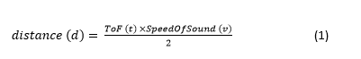 距离(d)是从无人机上的超声波传感器到地面/物体的距离,ToF(t)是前面定义的ToF,而SpeedOfSound(v)是通过介质的声速。ToF(t)×SpeedOfSound(v)除以2,因为ToF计算超声回波往返物体的时间。