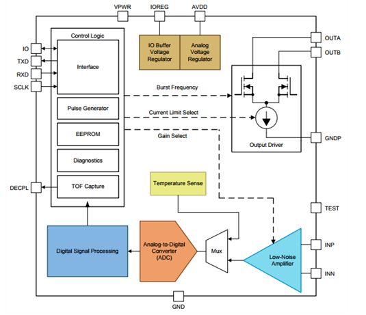 超声波传感技术也是一项具有成本竞争力的技术,特别是在使用PGA460等集成解决方案时,其中已包括大部分所需的芯片。PGA460既可以使用半桥或H桥直接驱动传感器,也可以使用变压器驱动传感器;后者主要用于密封的的“密闭”传感器。PGA460还包括用于接收和调节超声回波的完整模拟前端。此外,该器件还可以通过数字信号处理来计算ToF(见图4)。