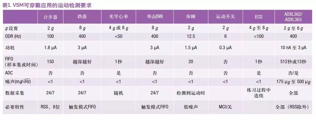 表1所示为部分生命体征监测(VSM)应用及其在具体应用中的对应设置。用于可穿戴应用的加速度计通常可以对运动分类;检测自由落体;测量运动是否存在以确定是使系统上电、关断还是休眠;辅助实现数据融合,供ECG和其他VSM测量使用。同样的加速度计也用在无线传感器网络和物联网应用中,因为它们具有超低功耗的特性。